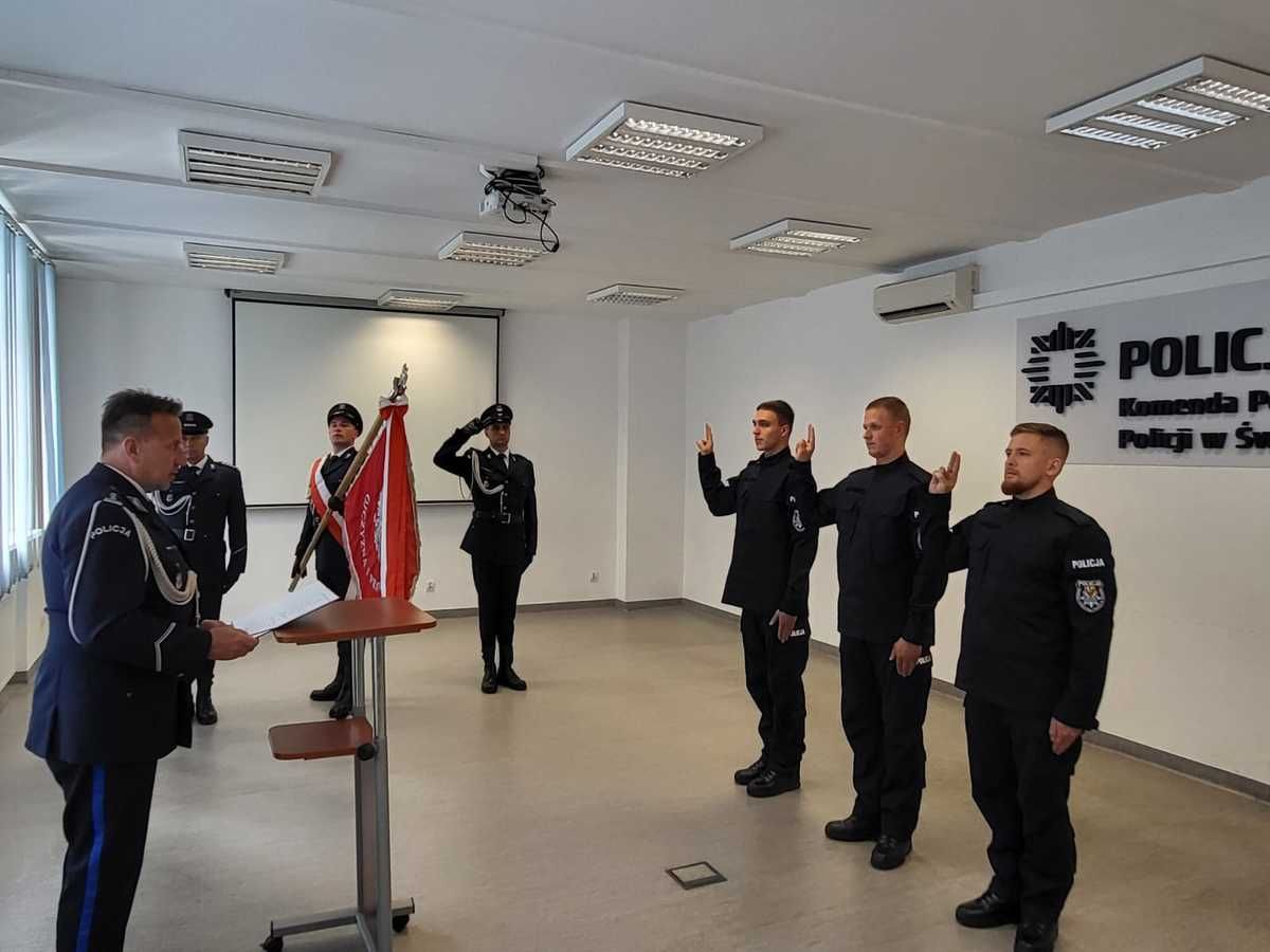 Szeregi świdnickiej jednostki zasiliło czterech nowych funkcjonariuszy. Jeden policjant został przyjęty ponownie, a trzech policjantów wypowiedziało dziś rotę ślubowania. Niedługo nowi funkcjonariusze rozpoczną szkolenie podstawowe w jednej ze szkół policyjnych. Szkolenie zakończone będzie egzaminem, którego pozytywne ukończenie wiąże się z rozpoczęciem prawdziwej służby w Policji. Nowi funkcjonariusze służbę pełnić będą w Wydziale Prewencji, Wydziale Ruchu Drogowego Komendy Powiatowej, Zespole Prewencji Komisariatu Policji w Świdnica.