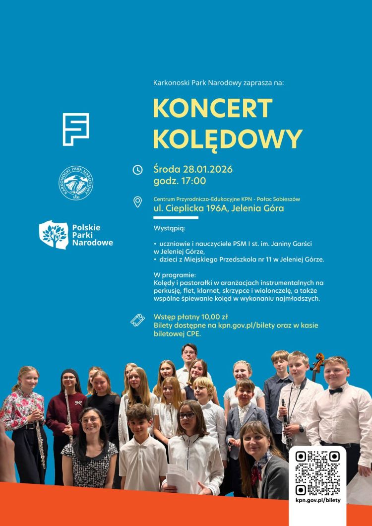 Serdecznie zapraszamy na Koncert kolędowy uczniów Państwowej Szkoły Muzycznej I stopnia im. J. Garści w Jeleniej Górze oraz dzieci z Przedszkola nr 11 w Jeleniej Górze, który odbędzie się w sali konferencyjnej Centrum Przyrodniczo-Edukacyjnego Karkonoskiego Parku Narodowego Pałac Sobieszów przy ul. Cieplickiej 196A, 58-570 Jelenia Góra w dniu 28 stycznia 2026r. o godz. 17:00.