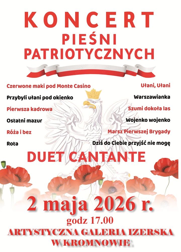DUET CANTANTE zaprasza na niezapomniany koncert z pieśniami patriotycznymi Prosimy o przygotowanie spiewników i spiewanie wspólnie z Duetem Cantante