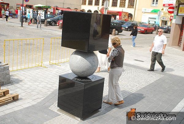 Wielu przechodniów podchodzi przyjrzeć się pomnikowi.