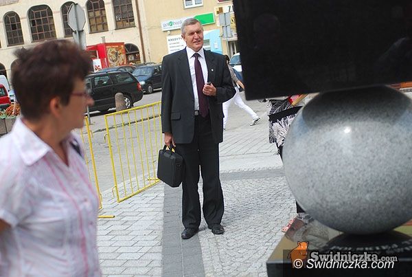 Członek zarządu województwa Zbigniew Szczygieł przygląda się też rzeźbie z zainteresowaniem.