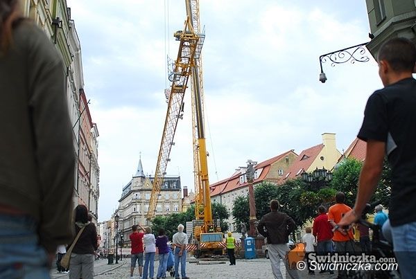 W Rynku trwa budowa wieży ratuszowej. Wznosi ją ogromny żuraw.