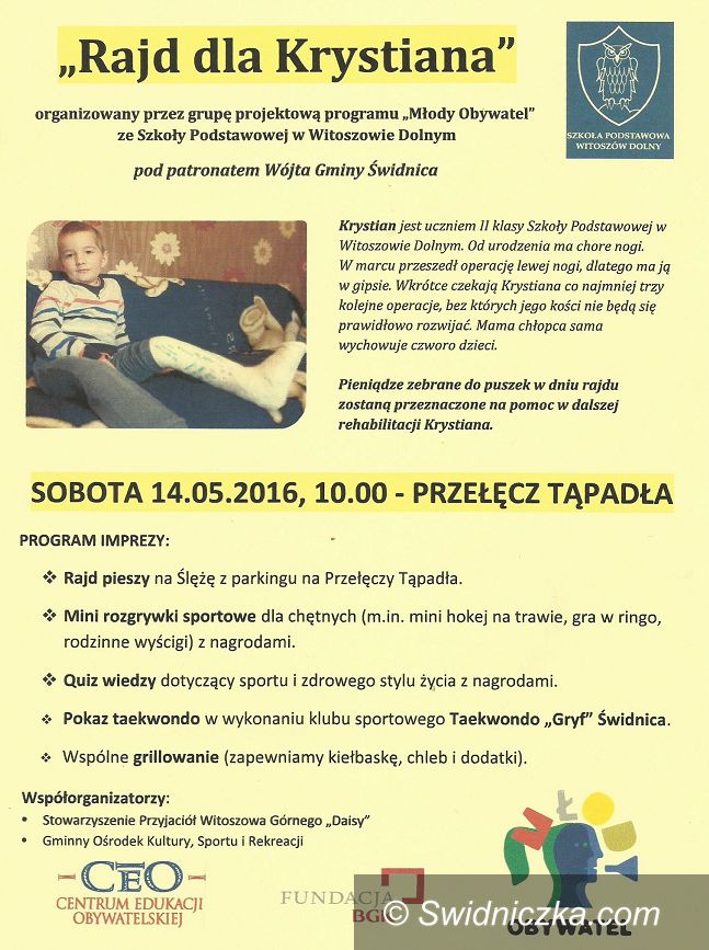 Krystian jest uczniem II klasy Szkoły Podstawowej w Witoszowie Dolnym. Od urodzenia ma chore nogi. W marcu przeszedł operację lewej nogi, dlatego ma ją w gipsie. Wkrótce czekają Krystiana co najmniej trzy kolejne operacje, bez których jego kości nie będą się prawidłowo rozwijać. Mama chłopca sama wychowuje czworo dzieci.