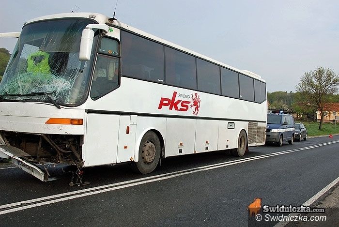 Autobus jechał ze strony Dobromierza. Kiedy volkswagen był już na drodze krajowej autobus uderzył w jego tył, spychając auto na stojący przy jezdni dom.