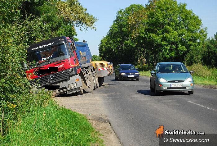 Tir w rowie, zablokowana droga między Nowym a Starym Jaworowem